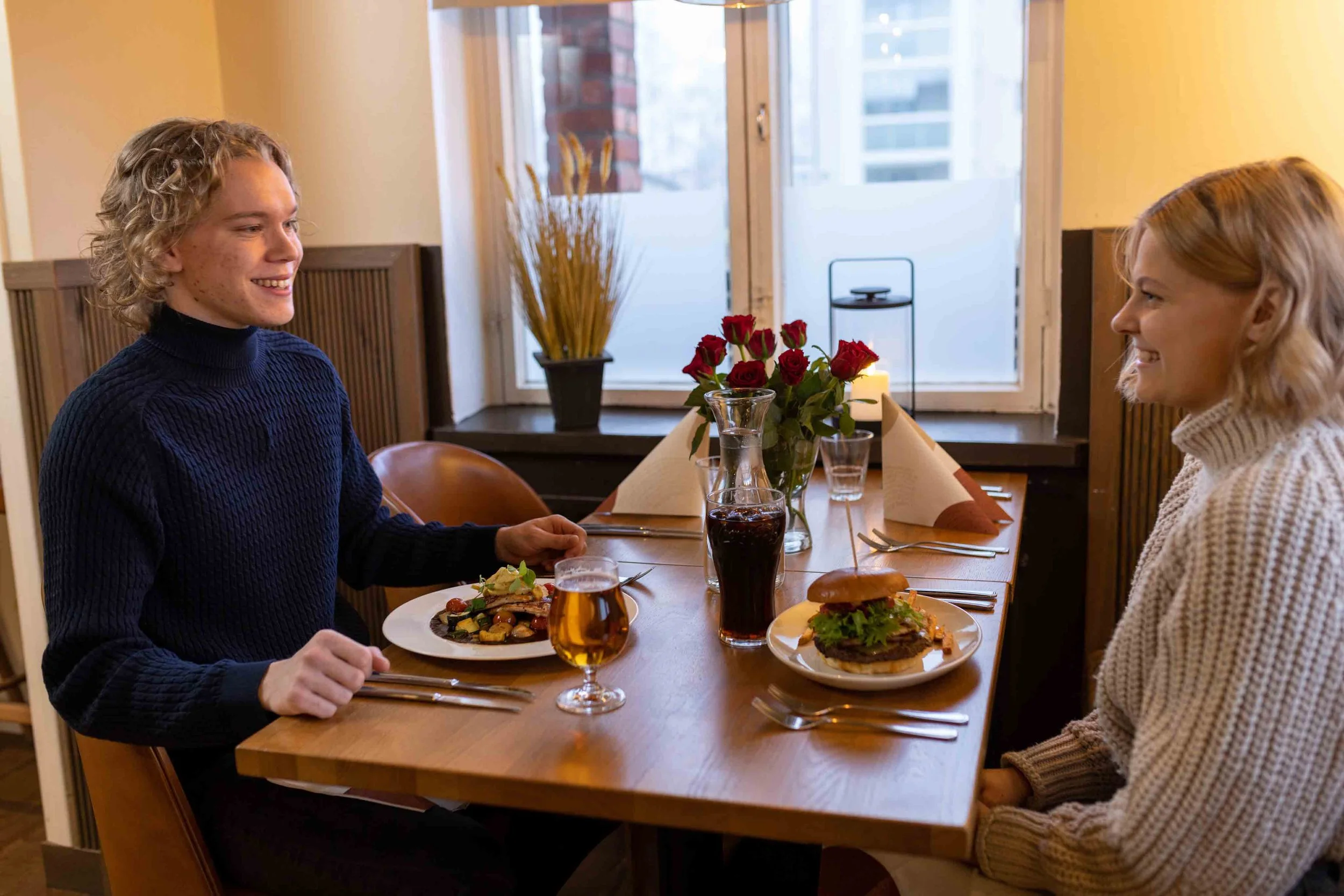 Kaksi ihmistä nauttimassa ateriaa ravintolassa, keskustellen ja nauraen, pöydällä ruoka, juomia ja kukkakimppu.